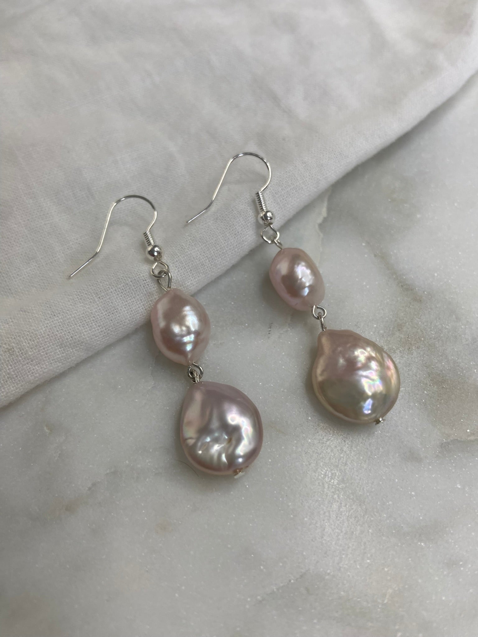 This pair is handcrafted on the coast of Cornwall, it uses 2 rose tinted rice freshwater baroque pearls and two coin beads with silver plated chain and findings. Each earring measures 3.5cm in length.