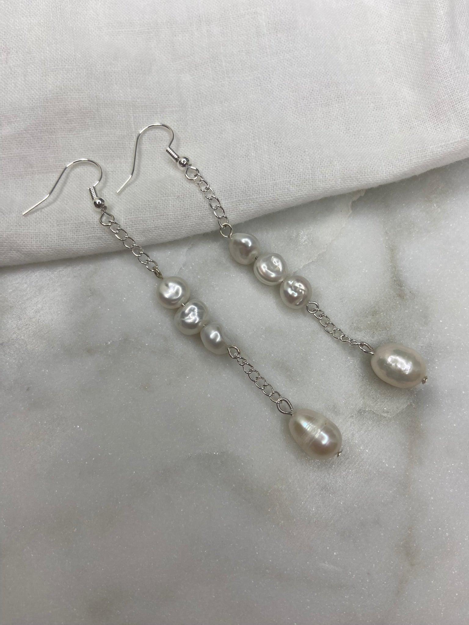 Handcrafted on the coast of Cornwall, these earrings use a total of 8 dainty freshwater baroque pearls, with silver plated chain and findings. Each earring measures 7cm in length.