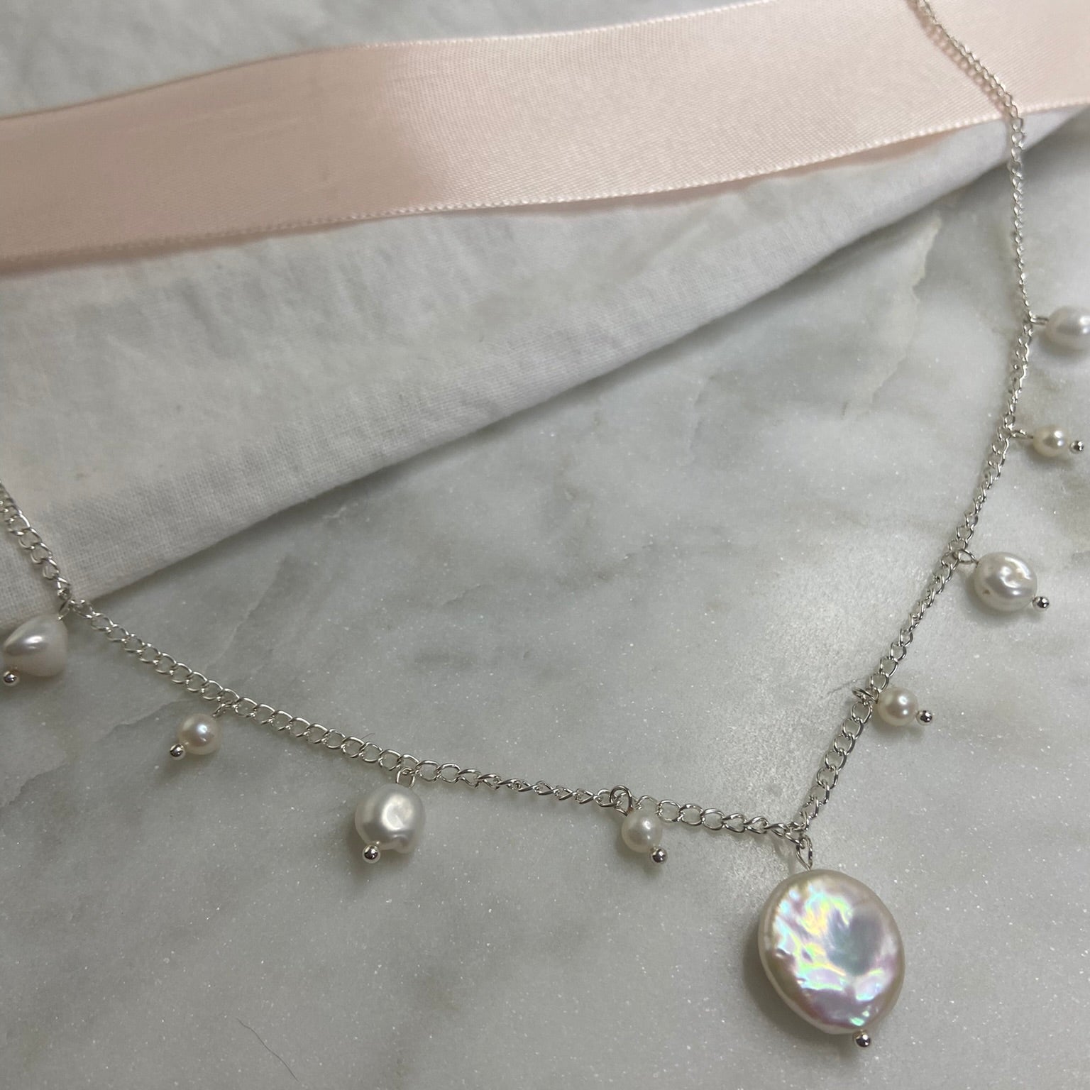 This delicate piece is handcrafted on the coast of Cornwall, it uses 8 small freshwater baroque pearls, a large centrepiece pearl and Silver plated chain and measures 38cm.